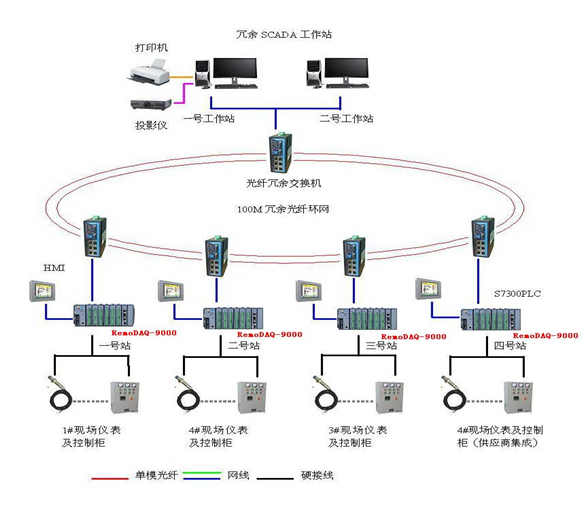 中央控制室的監(jiān)控管理站系統(tǒng)完成全廠的自動控制。包括兩套互為熱備的工作站(監(jiān)控操作站、工程師站)、打印機、UPS電源。中央控制系統(tǒng)通過工業(yè)以太網(wǎng),采用光纜與各現(xiàn)場控制PLC站連接。這兩套工作站為熱冗余配備,可以分別側重監(jiān)測、組態(tài)功能,故障時互為備用,具有靈活的運行方式。