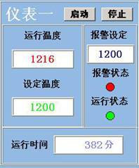 上部顯示報警設(shè)定值并可對其進(jìn)行修改,中部顯示當(dāng)前報警狀態(tài)(當(dāng)測量值大于報警設(shè)定值時報警狀態(tài)會顯示為紅色),下部顯示儀表的運(yùn)行狀態(tài)(當(dāng)點(diǎn)擊啟動按鈕后,運(yùn)行狀態(tài)為綠色;當(dāng)點(diǎn)擊停止按鈕后,運(yùn)行狀態(tài)為紅色)。