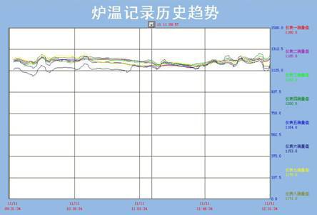 ,趨勢右側(cè)的儀表數(shù)值會隨游標(biāo)的移動而變化。上圖中游標(biāo)右側(cè)的數(shù)字表示當(dāng)前曲線位置的日期是11日時間為11時9分57秒,此時趨勢圖右側(cè)的儀表數(shù)值即為游標(biāo)處曲線對應(yīng)的溫度值。