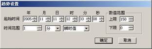 初始啟動歷史趨勢界面時,曲線為實(shí)時趨勢。當(dāng)用戶雙擊曲線任意位置時,系統(tǒng)會彈出“趨勢設(shè)置”窗口(如圖3-5)。這個窗口是用來設(shè)置曲線的顯示方式的。起始時間:設(shè)置曲線由什么時間開始提取歷史記錄。時間范圍:設(shè)置曲線橫坐標(biāo)的時間范圍,即調(diào)用多少時間段內(nèi)的趨勢。數(shù)值范圍:設(shè)置曲線縱坐標(biāo)數(shù)值的上限和下限。