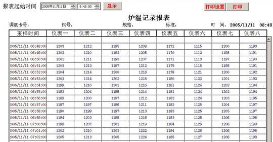 表格上面的調(diào)度卡號、鋼號、規(guī)格、標(biāo)準(zhǔn)可以在用戶打印報表時手動通過鍵盤輸入。右側(cè)時間顯示的是當(dāng)前時間。